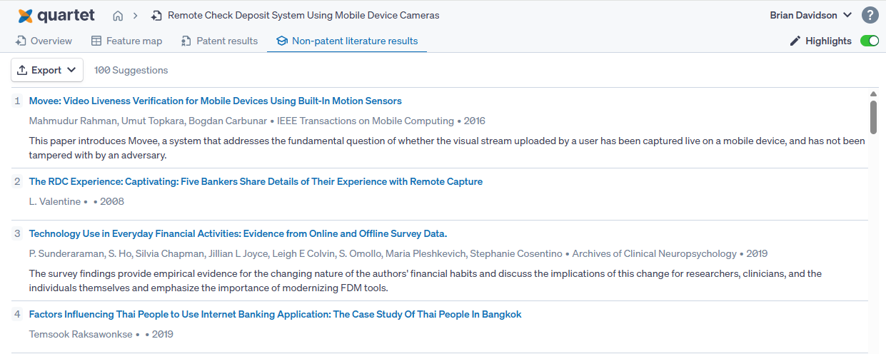 The non-patent literature tab shows the top 100 NPL results that Auto Search has found. Clicking on one of these will take us to an external link to review the article. This list can be exported to a PDF, which will include all the information shown on this tab, with links embedded in the PDF.
