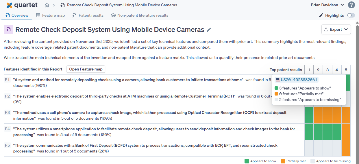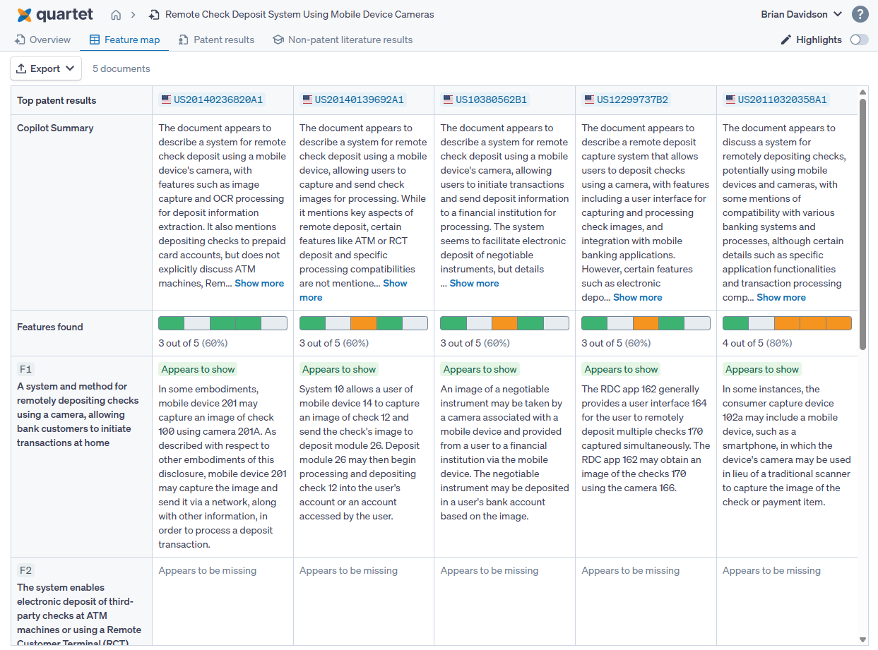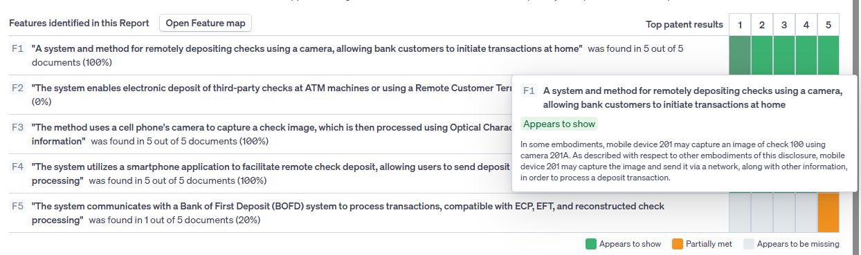 The landing page for the Auto Search results shows an overview of the top five results that Auto Search has found, how they relate to the subject features of the search, as well as non-patent literature results if applicable. The feature map preview shows the subject features and a small chart showing the representation across the top 5 search results, where green is appears to show, orange is partially met and grey is appears to be missing. Hovering over the numbers will provide the publication information, while hovering over each cell will show the citation Auto Search has chosen to match the subject feature.