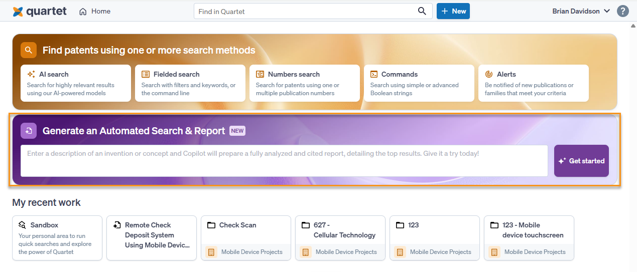 Automated Search & Report is accessed from the front page of Quartet, below the search methods toolbar, and above "My recent work"