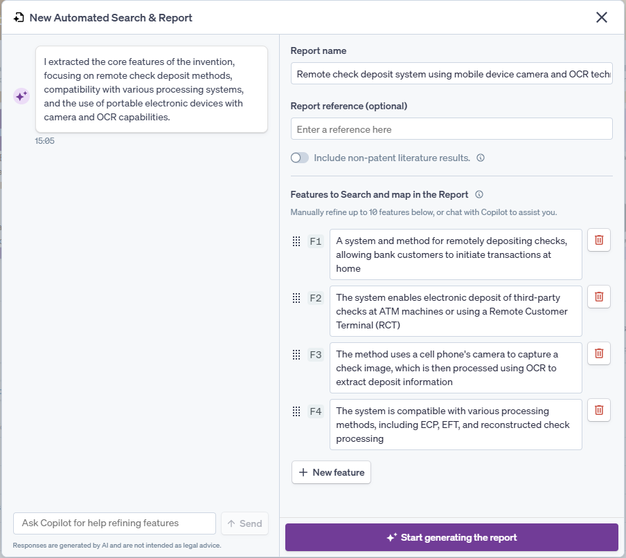 From this screen, the features can be manually edited by clicking in the box and typing, with a button at the bottom allowing for creation of additional features. Please note the maximum number of allowed features is ten; the system will normally attempt to create roughly four subject features, though this number will vary based on the disclosure. When adding in or editing features, it helps to have terminology and words consistent across features, as well as having features being interlinked. For instance, the features above discuss the use of a camera taking a picture of a check, then running OCR on the image of the check. Note in feature 3, it explicitly links taking a photo of the check and running OCR on that check image. That is superior to having two separate features such as