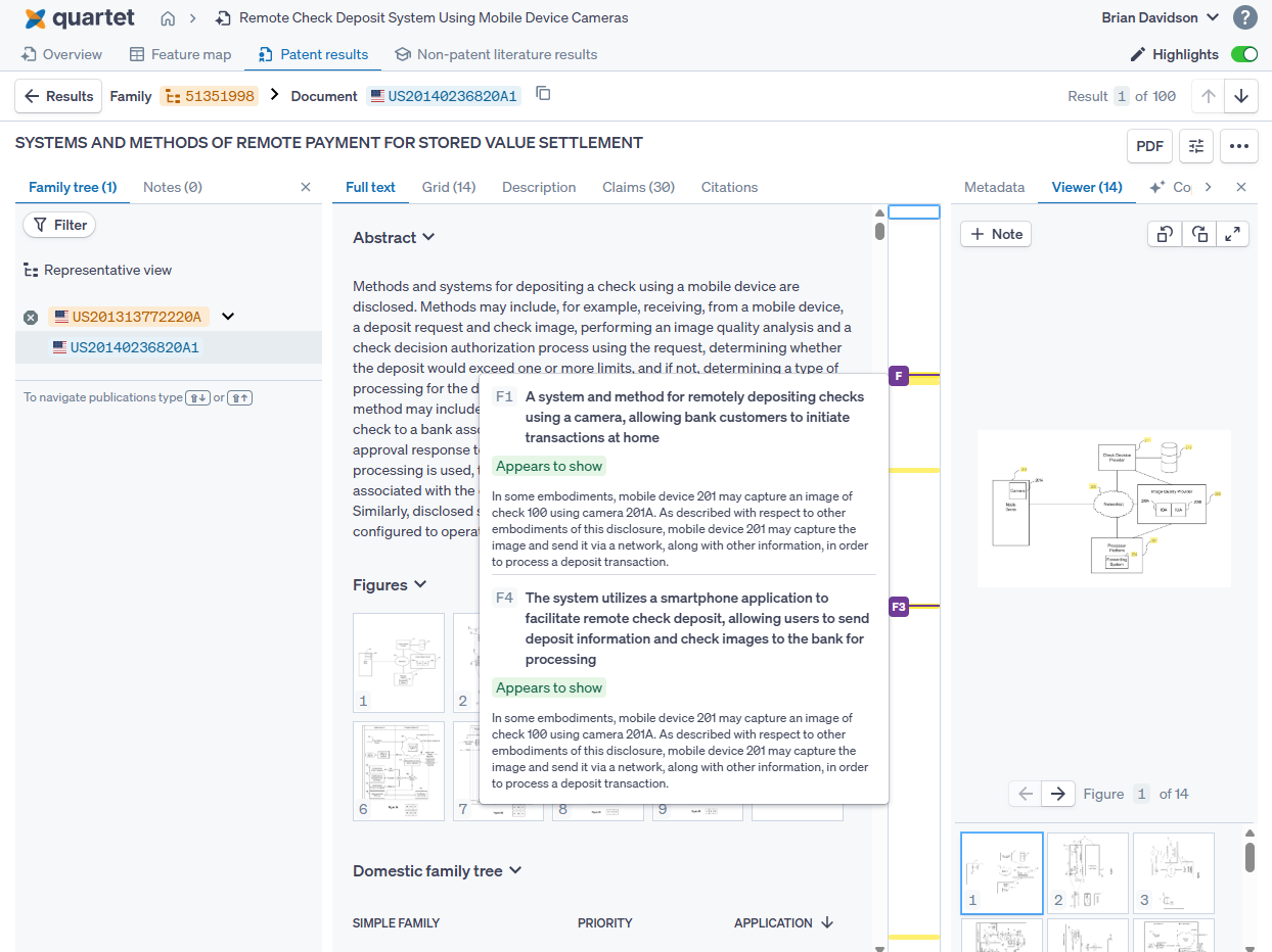 Once "Get started" has been pressed, Auto Search will analyze the disclosure and automatically pull out subject features and display them in a list, with an Ask Quartet pane to the left.