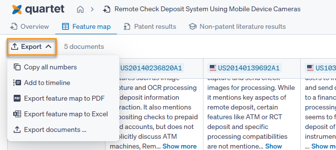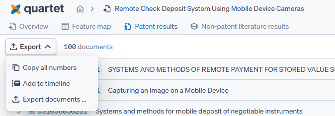 Additionally from the patent results tab, the 100 results shown can be exported with three methods; copy numbers will copy all numbers to the clipboard, separated by a comma, add to timeline will add the 100 numbers to the timeline of a specified project, and export documents will bring up the Quartet export dialog, allowing us to choose the patent data exported.