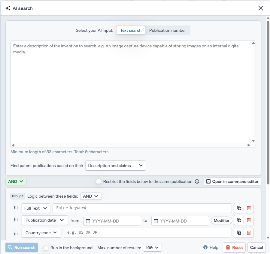 Within the AI Search form, freely enter text to describe the invention, while using optional filters to ensure the AI search is within the correct searching area.