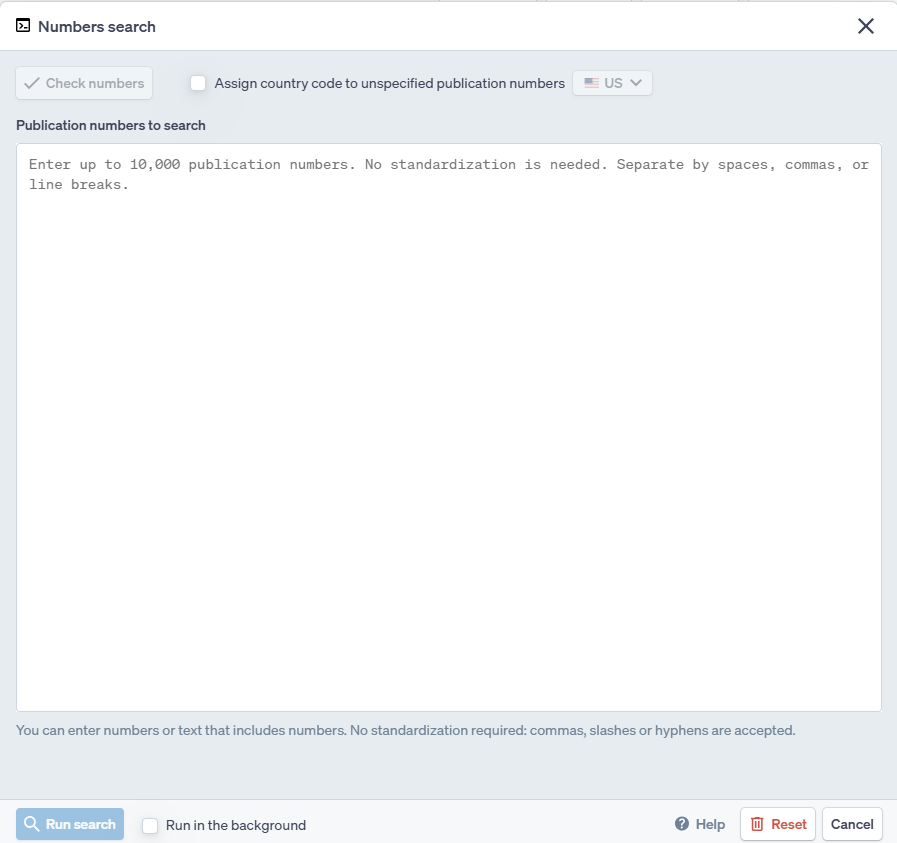 Numbers Search is used to enter publication numbers to pull a set of results. Currently the system supports a large number of formats within the 6 largest jurisdictions: US, WO, EP, CN, JP, and KR; additional jurisdictions are supported but may not have as much flexibility in recognizing obscure or nonstandard number formats.