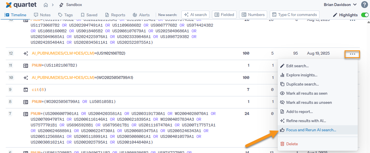Focus and Rerun is currently available for AI searches and can be accessed multiple ways. The first option is from the timeline itself, click on the 3 dots for an AI search string to access the option to Focus and Rerun the AI search.