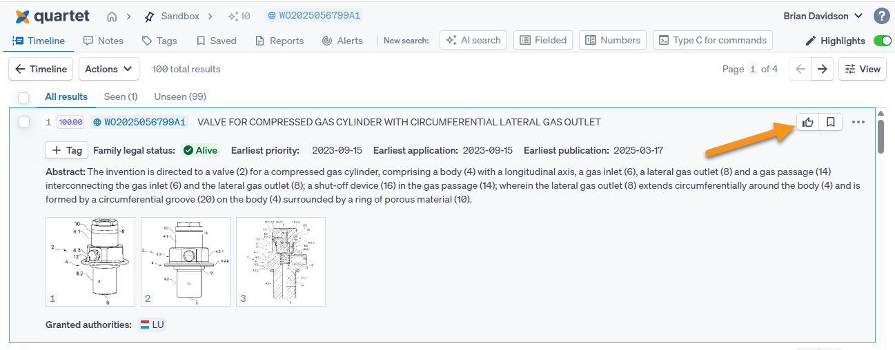 Second is within the AI search results. While reviewing the list of returned documents, a thumbs up button is be available in the top right corner of every record, next to the save button.