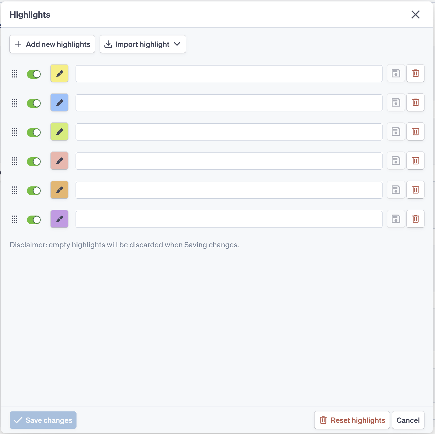 Highlights at the top will have priority; highlights will take the color of a “higher up” color if the same term repeats in two different lines.