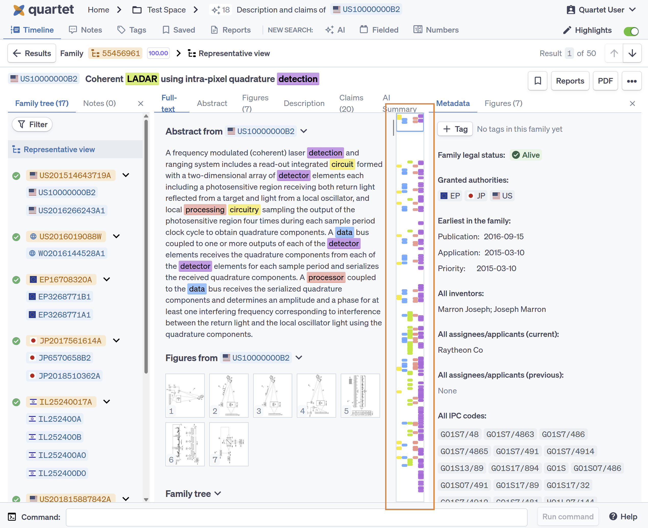 In Detail view, a highlight Minimap is placed between the center pane and right pane. The Minimap shows where and how frequently within the document highlights are present. Using the Minimap, each highlighted area of the document is shown, allowing quick navigation to sections of interest.