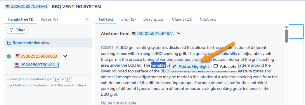 Highlights may also be added from the detailed or representative view. Use the cursor to drag and select the term to be added to the systems highlights and a dialog box will pop up.