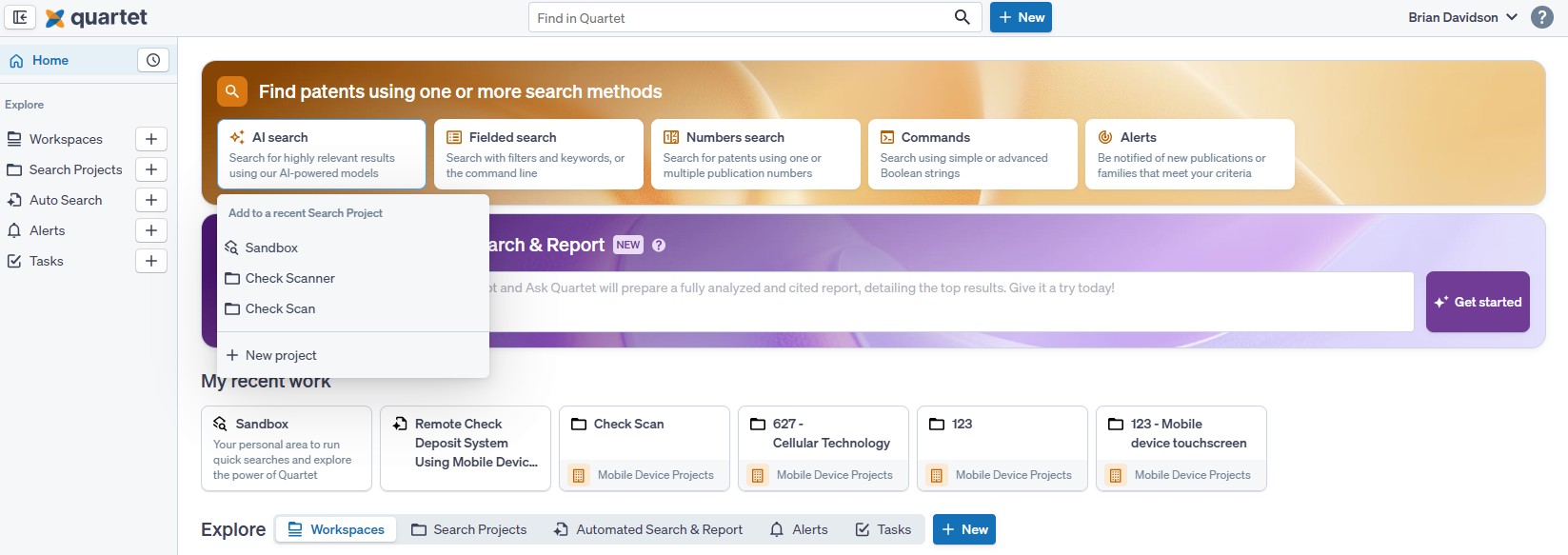 - Generate an Automated Search & Report: Quartet Automated Search & Report is an AI search and mapping tool which helps run an initial search on an idea and provide analysis in the form of an automatically generated report of the top five publications. Paste a description and let Automated Search and Report extract key features and map relevant publications. For detailed use on the Automated Search and Report, see this article.