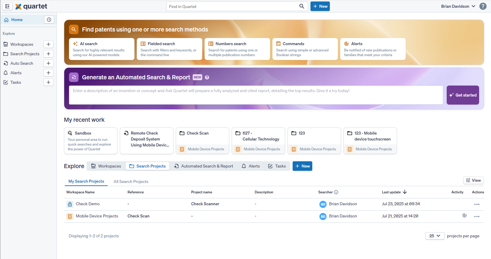 The Home page is the central hub of Quartet, allowing quick access to your Workspaces, Projects, and Automated Search Reports, as well as providing a quick launch point to create new Workspaces, Projects, and Automated Search Reports. Additionally, the Home Page is the initial landing zone for quartet, allowing you to get used to the Navigation Toolbar on the left. For more detail on the Navigation Toolbar see here.