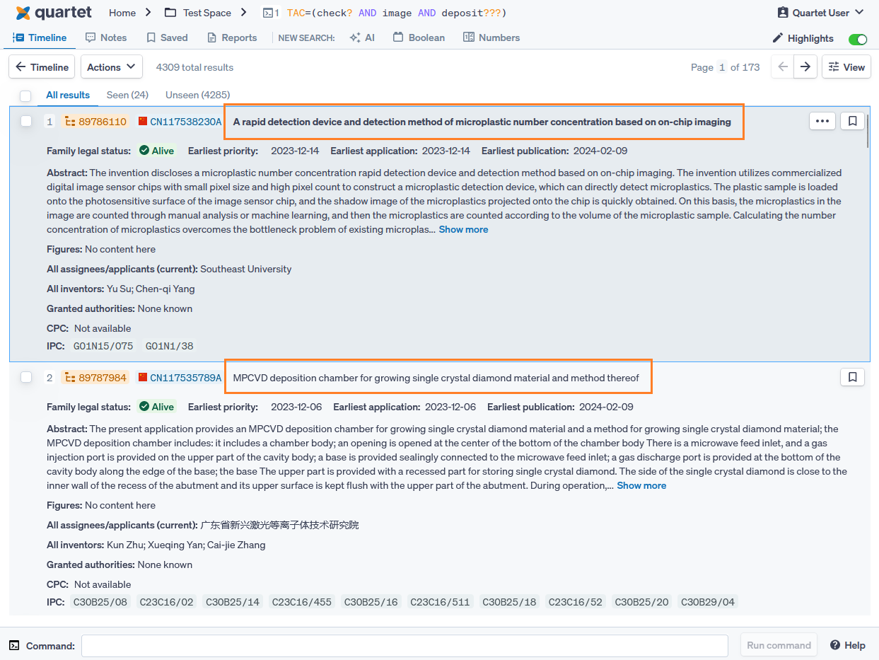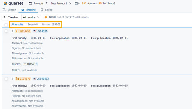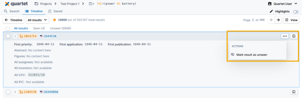 The Seen/unseen functionality is a way in Quartet to identify patent families which they have already reviewed. Any family that is viewed for longer than three seconds in Detail view will be marked as “seen” for all previous and future queries within the same project.